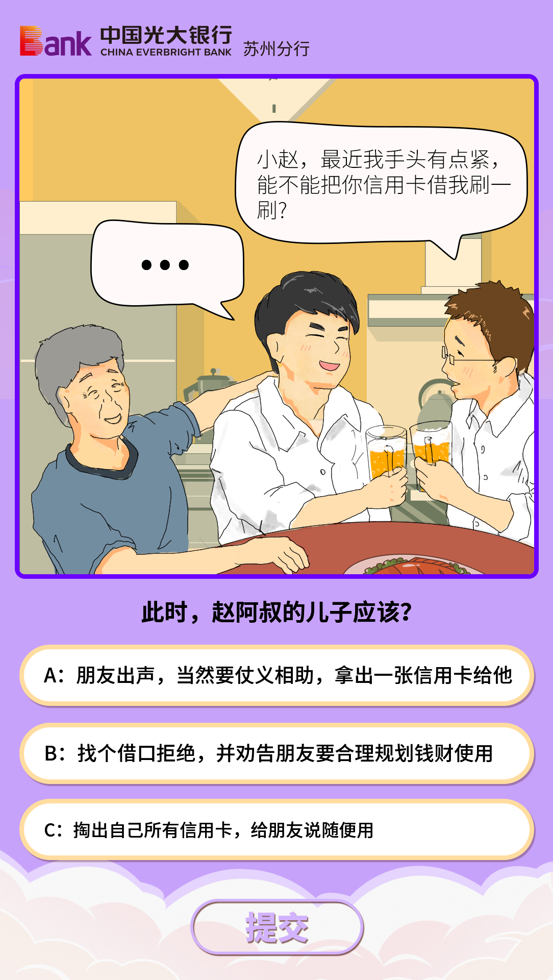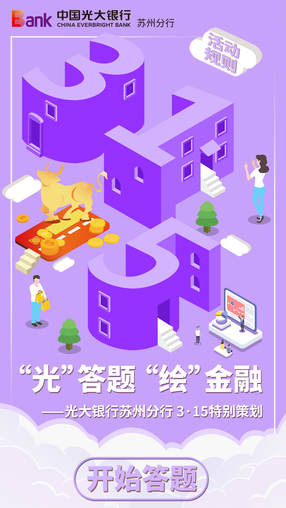 自3月10日起,中国光大银行苏州分行渠道管理部联合数字金融部对外发布“‘光’答题,‘绘’金融”线上宣传活动,以鲜活的场景化案例、图文并茂的漫画答题形式,有效强化了金融消费者对自身权益的重视,进一步增强了金融消费者风险责任意识与风险防范能力。截至发稿前,已吸引近4万名用户参与活动,实现了金融消费者的有效触达。