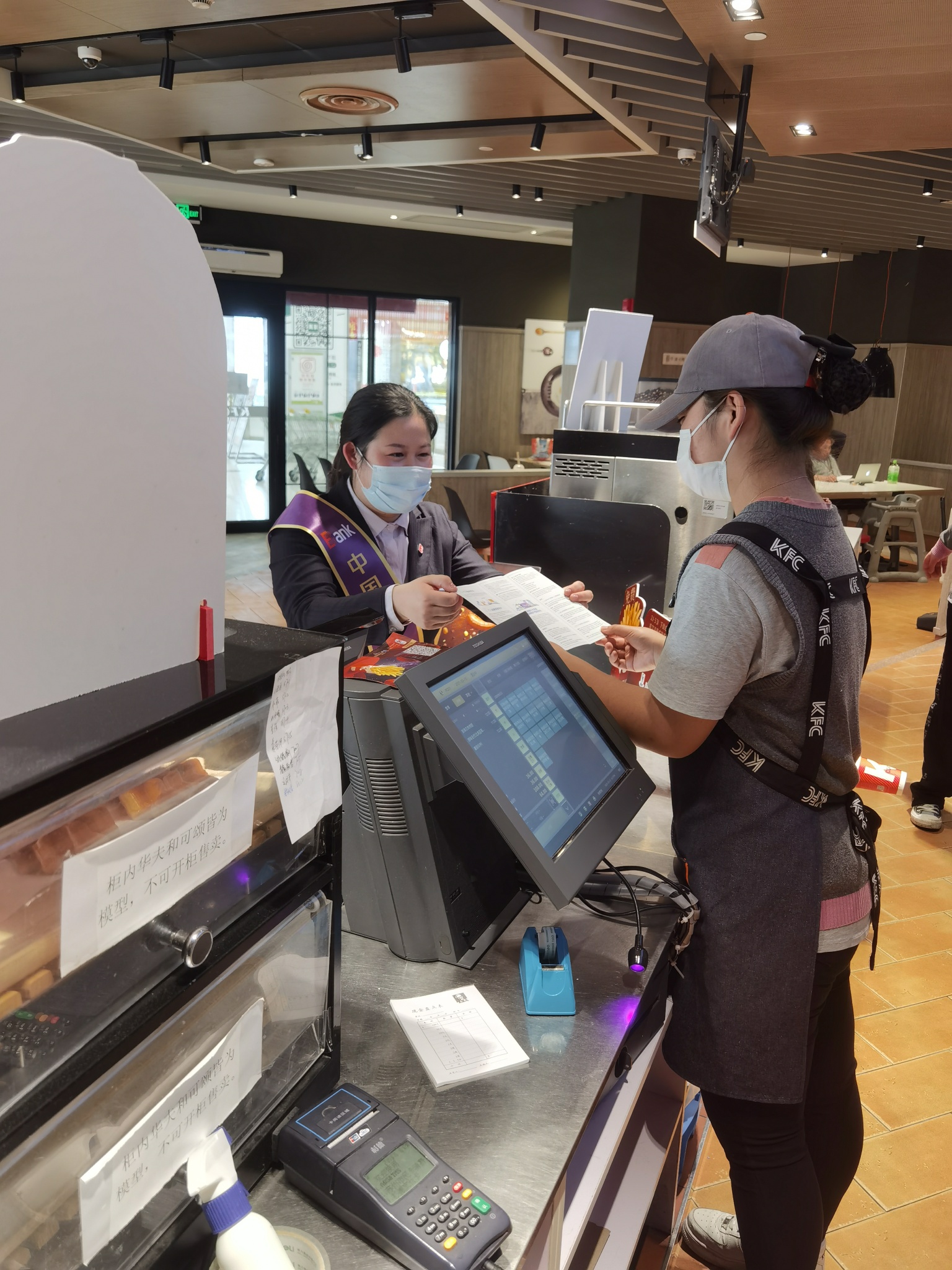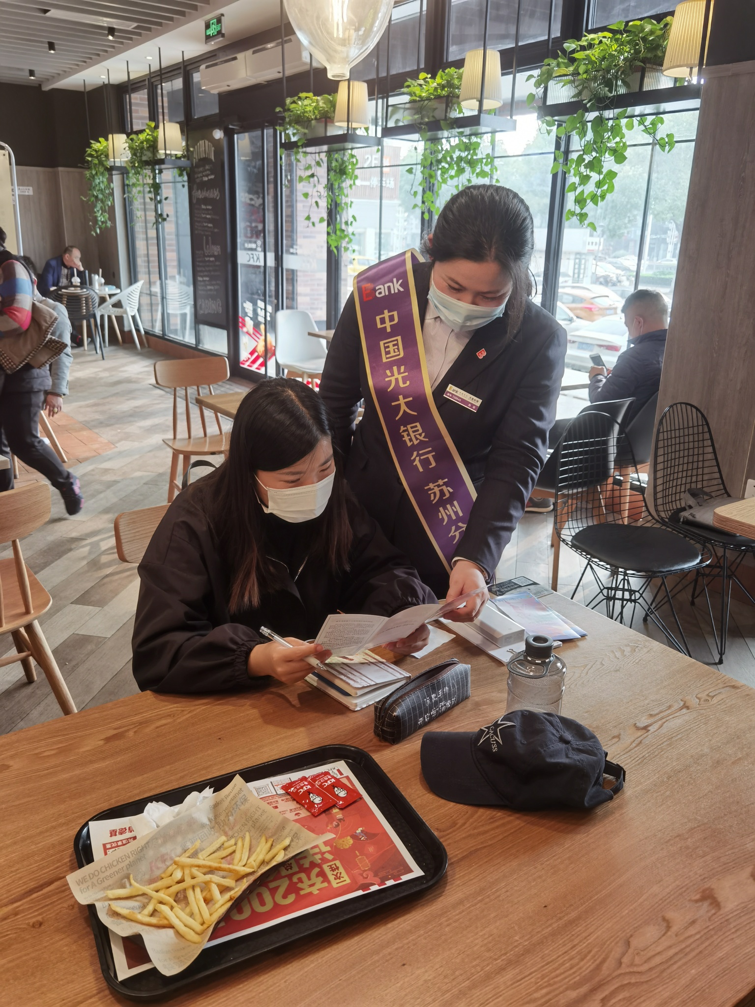 (太仓支行员工在工厂食堂门口驻点宣传)