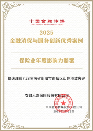 近日,在中国金融传媒举办的“保障金融权益 助力美好生活”2025金融消保与服务创新主题直播活动中,2025金融消保与服务创新优秀案例名单正式公布,农银人寿“快速理赔7.28湖南省衡阳市南岳区山体滑坡灾害”案例荣膺“保险业年度影响力赔案”。