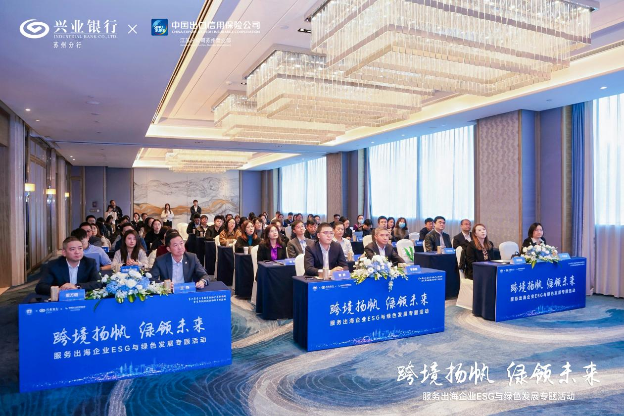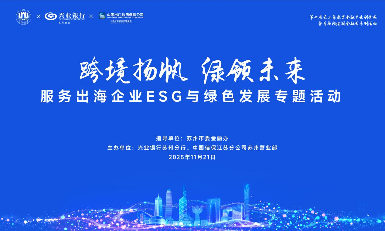 初冬寒意渐,外贸热潮涌。为助力苏州出海企业破解ESG合规难题,增强企业“走出去”综合能力,进一步书写好绿色金融大文章,今天(11月21日),由苏州市委金融办指导,兴业银行苏州分行与中国信保苏州营业部联合主办的“跨境扬帆 绿领未来”服务出海企业ESG与绿色发展专题活动成功举办。作为苏州市首届阳澄湖金融周暨第四届长三角数字金融产业创新周子活动,活动邀请了来自苏州新能源、高端装备等领域的出海企业高管齐聚一堂,共话绿色转型与海外拓展新路径。