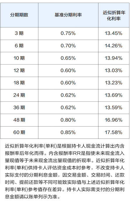 每期分期利息=分期本金总额x每期分期利率。账单分期期数不同,分期利率不同,详见下图: