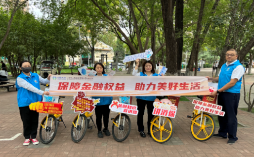 天津分公司的骑行宣传小队从海光寺商圈出发,车筐里摆着太平吉象和“消保团子”玩偶,悬挂着醒目标语,一路骑行至街边公园、公交站、学校等人流密集区,向市民发放折页、讲解知识。“共享单车+金融宣传”,既环保又亲民,真正让知识“骑”进百姓心里。